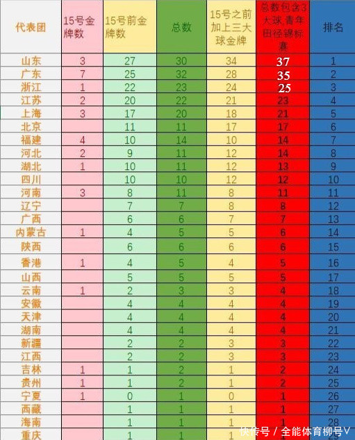北京时间11月16日消息,2025年第15届全运会结束第六比赛日的争夺。这个比赛日,总共产生了32枚金牌,东道主广东代表团强势发力,一日豪夺7枚金牌,山东队收获3枚金牌。金牌榜上,山东队以37金继续高居第一,广东队以35金排在第二,浙江队以25金排在第三。